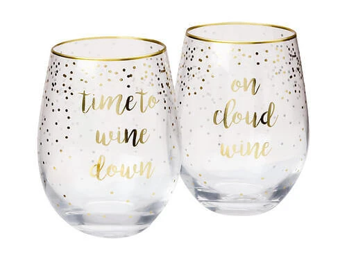 Cheers to the holidays with these witty glassware sets from the Celebrations collection. Each set includes two stemless glasses decorated with festive gold confetti dots and a cheeky saying.